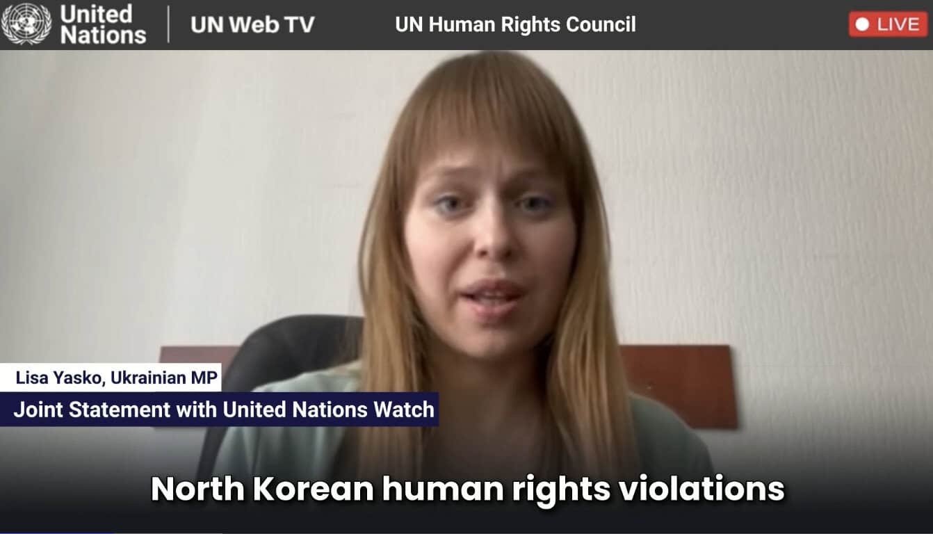 UN Watch brought Ukrainian MP Lisa Yasko to the floor of the U.N. Human Rights Council to call out North Korean human rights violations being committed related to Russia’s war of aggression in Ukraine.