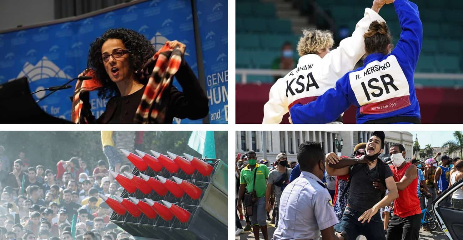 Trending UN Watch tweets from July: Iranian plot to kidnap dissident Masih Alinejad in New York foiled by FBI; Israeli and Saudi judokas embrace after competing at Tokyo Olympics; Gazans call out Hamas for storing explosives among civilians; Cuban protesters are crushed by the regime’s plainclothes goons; and many more below.