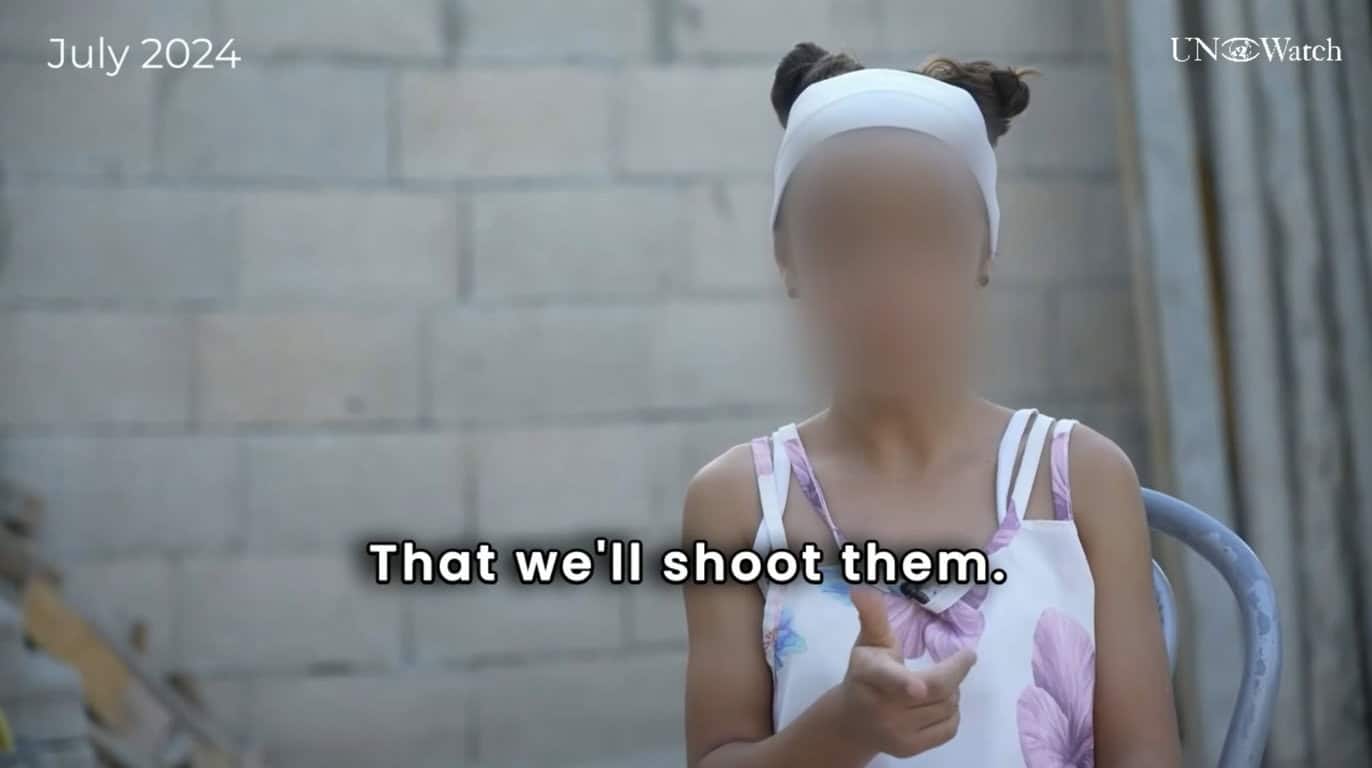 Aya, a student at the UNRWA Tulkarm Camp Girls’ School, was taught that “we don’t like Israel,” that Palestinians will “shoot” Israelis, and that the martyrs are “big heroes.” Aya says that she wants to join the resistance “so that I can fight, and take my rights from Israel and become a martyr.”