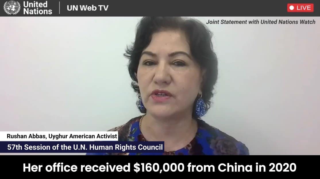 UN Watch brought Uyghur American Activist Rushan Abbas to the floor of the U.N. Human Rights Council to discuss U.N. Special Rapporteur Alena Douhan’s improper funding from China.